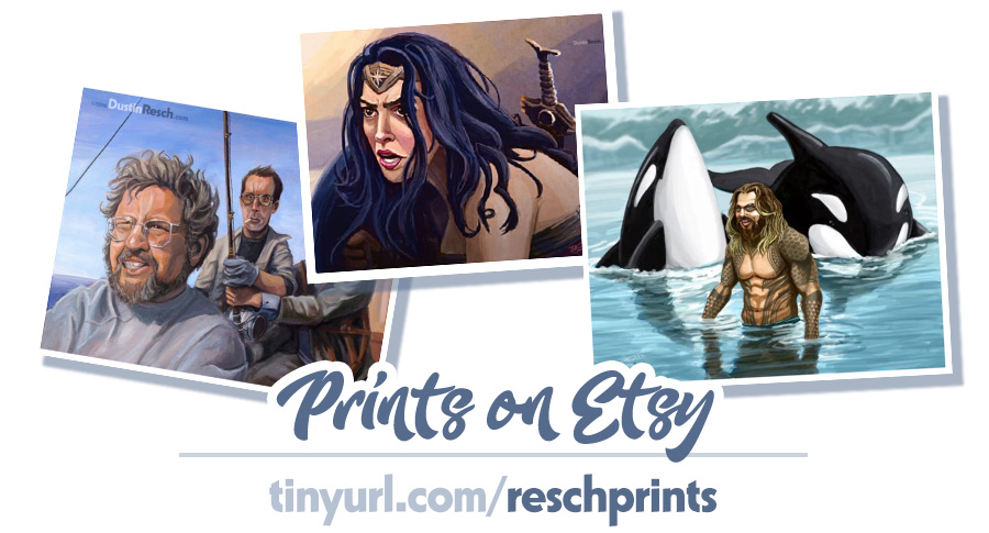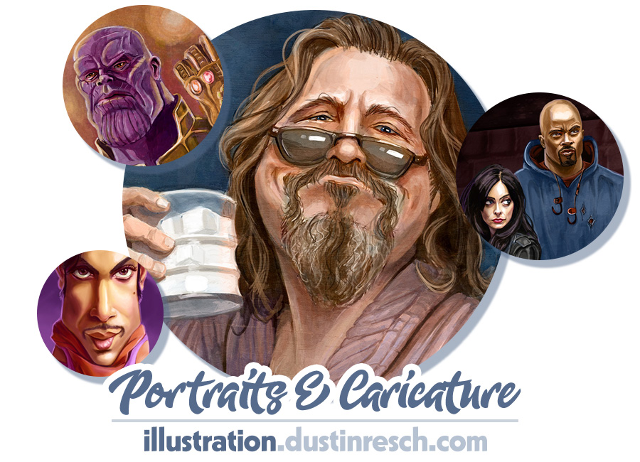 I also draw caricatures and portraits, and go to various Comic Con events to sell those. My work is mostly digital, painting on my big old Wacom Cintiq and my little portable Cintiq Companion, although I’m falling more and more in love with oil paints and pastels as well.